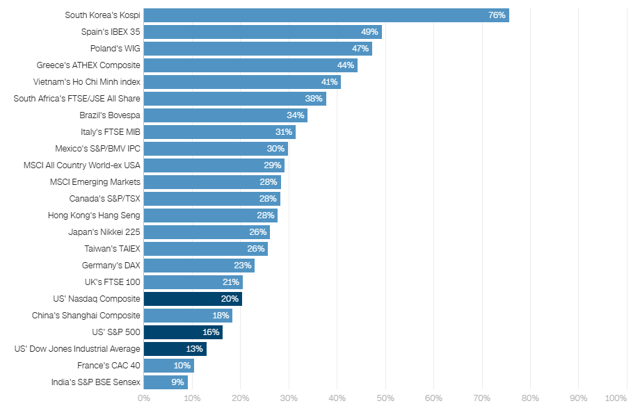Annual percentage gain for benchmark stock indices around the globe, in 2025